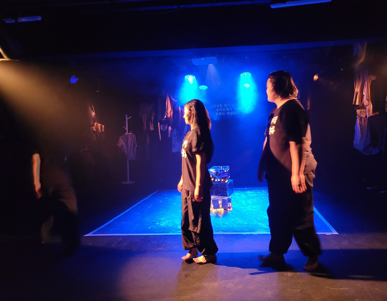 스팟이 배우들 뒷쪽에서 쏘는 통에 배우들은 후광을 받은 효과를 볼 수 있지만 관객석까지 각도가 잡혀있어서